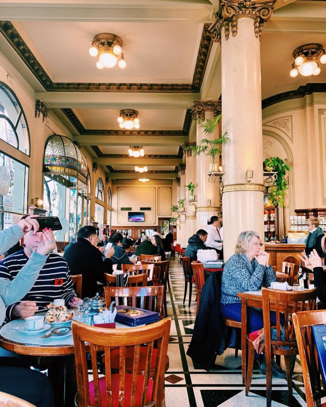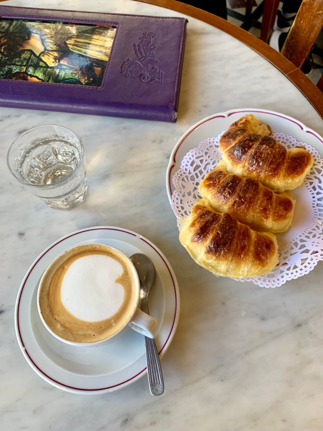 Today I decided to hit some of the main places I had read about online that many people said were “must-sees” in Buenos Aires, and they did not disappoint! I first took the bus to a famous old cafe called Café Las Violetas, located in the Almagro neighborhood. The building was constructed in 1920, and the decor on the inside mirrored this. I had a café con leche y tres medialunas, which are little croissants, and thoroughly enjoyed the ambiance and people watching.