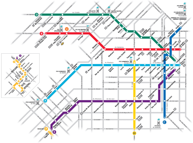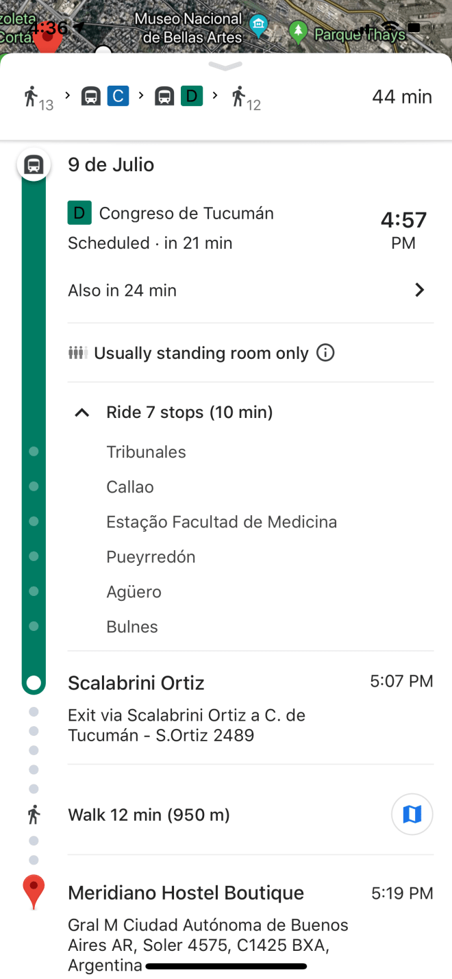 For example, in this screenshot, I had to take the D line, which is always green, from the station called 9 de Julio, towards Congreso de Tucumán. Make sure the sign above the street entrance you are going down says “a Congreso de Tucumán.” In this example, I had to get off at Scalabrini Ortiz, and since I had a screenshot of the stops the train would make, i was able to ensure once I got on the train that i was going the right way. The trains all have clear maps on them, indicating the order of the stops. Basically if you have any experience navigating any subway system, you will be just fine in Buenos Aires.